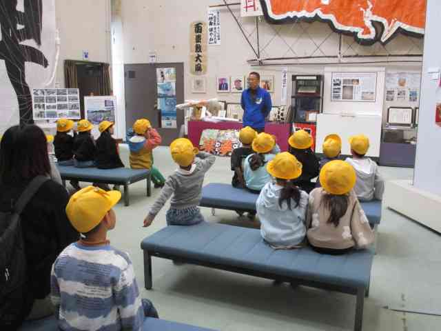 1年生が、校外学習に出かけました。大凧会館では大凧の歴史や様々な凧を見学して、その形や大きさに驚いていました。